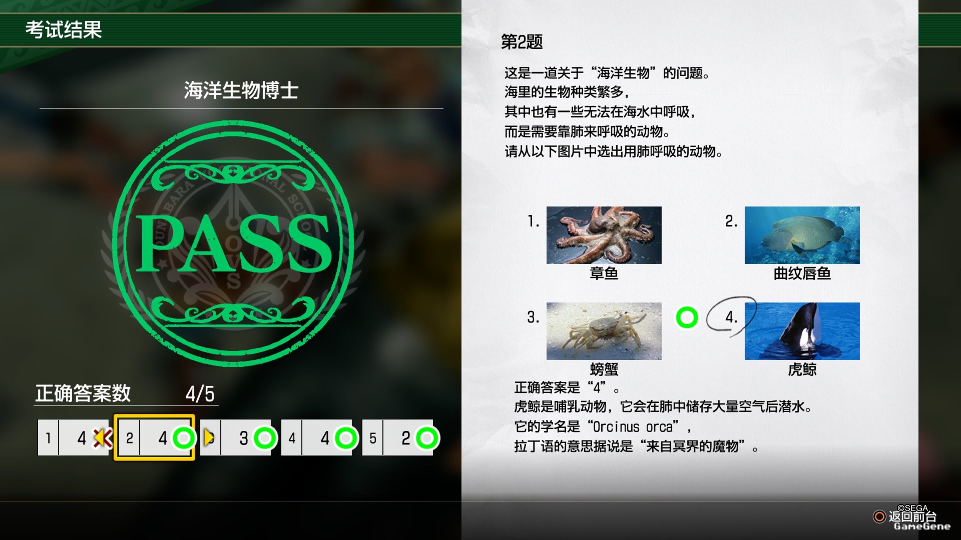 | 2 | 呼吸 | 海里的生物种类繁多,其中也有一些生物无法在海水中呼吸,而是需要靠肺呼吸的动物。请从以下图片中选出用肺呼吸的动物。 | 虎鲸,图片如下 |