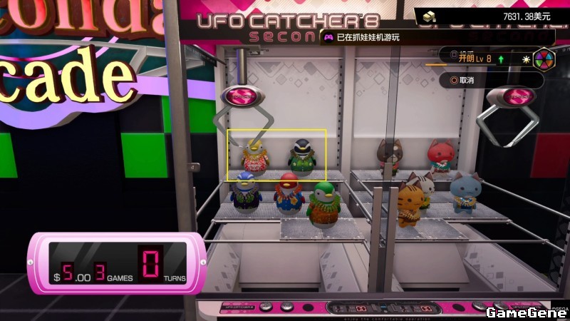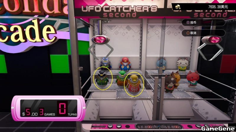 如图,5个种类的娃娃,能与服务对话,重置娃娃机,把后排不好抓的娃娃换到前面来。