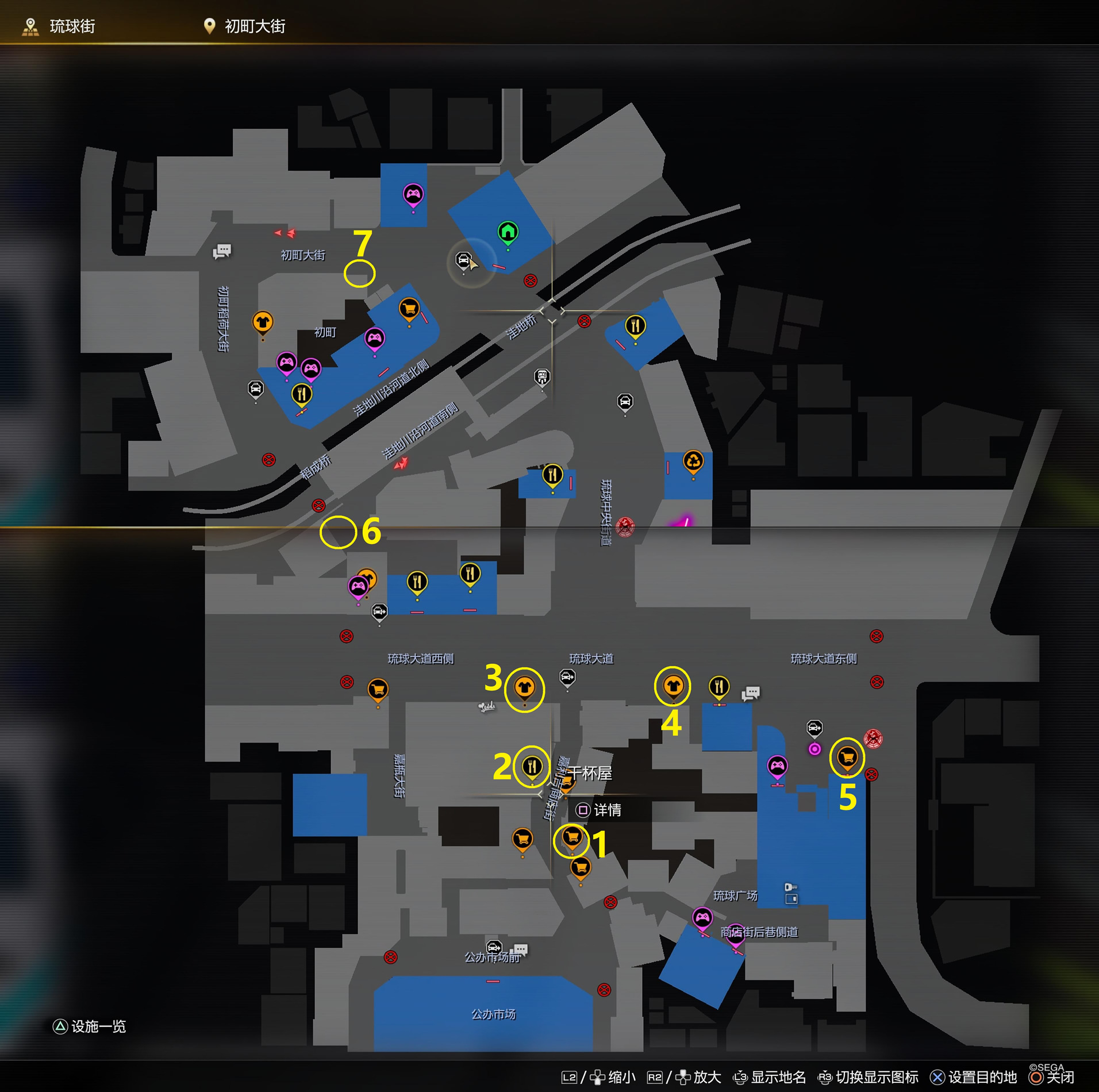 POPPO 琉球大道东侧店、我行我路、珠宝&时尚、满香叔果汁、真荣田药店;初町北侧的比嘉先生,耳朵不好得大声叫他;初町南侧的知念先生,背着老婆偷吃得轻点叫他。