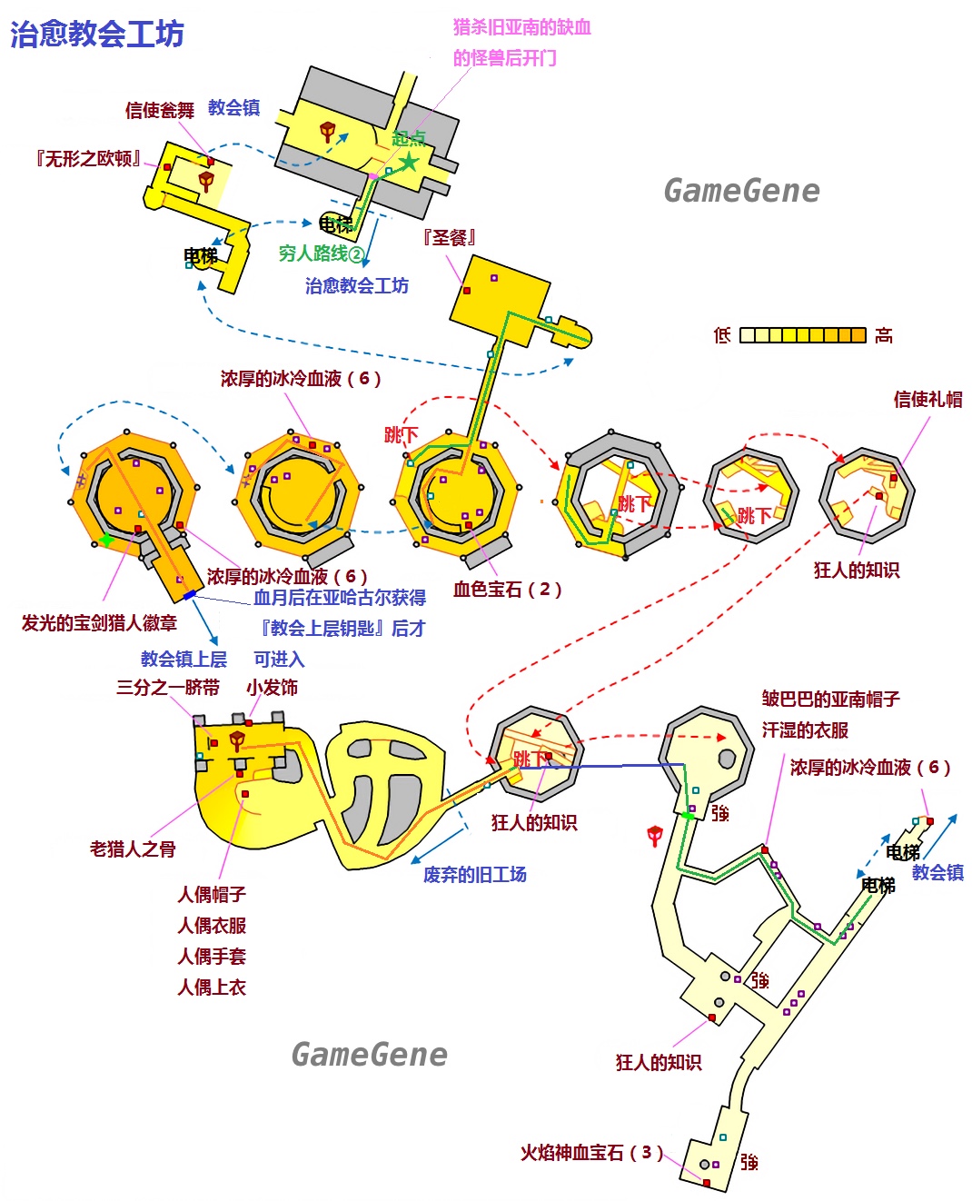 注意事项:穷人路线②往治愈教会工坊塔下跳的时候极容易死。