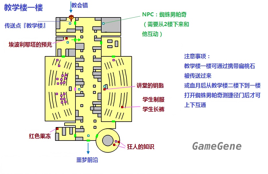 由于是通过扁桃石在教会镇亚哈古尔村口被传送过来的,无法前往教学楼2楼。