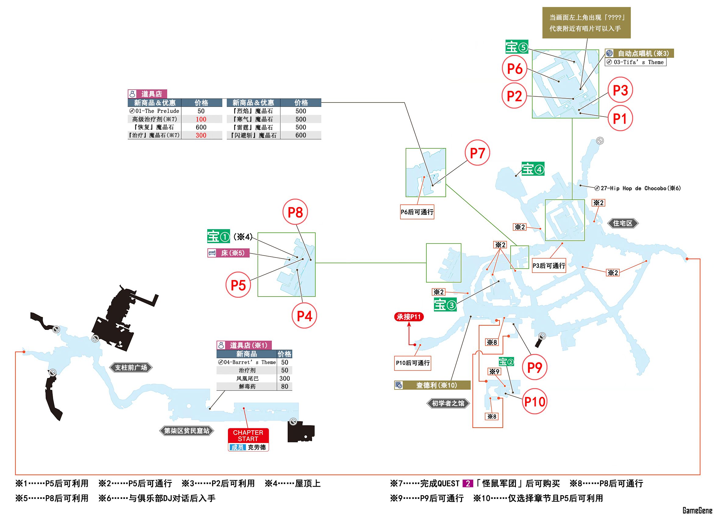 | P8 | 跟随蒂法回收玛蕾的JS过滤器货款 | 获得200GIL 关于休息点的情报。 完全恢复HP与MP。 HARD难度下仅恢复HP |