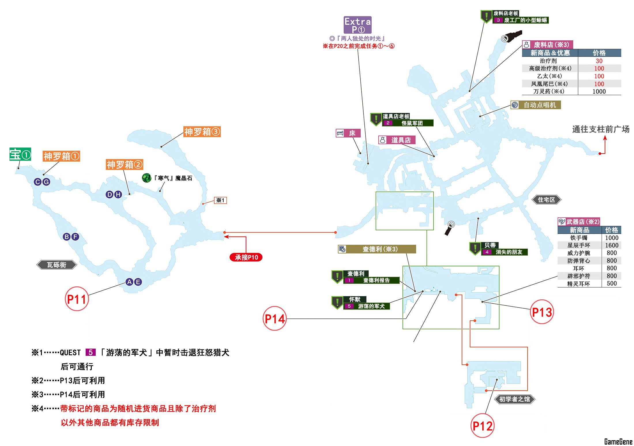 | P11 | 消灭瓦砾街的怪物 | 战斗A:巨口噬虫×2 战斗B:变异鼠×2 战斗C:巨口噬虫×1+变异鼠×1 战斗D: 巨口噬虫×2 |