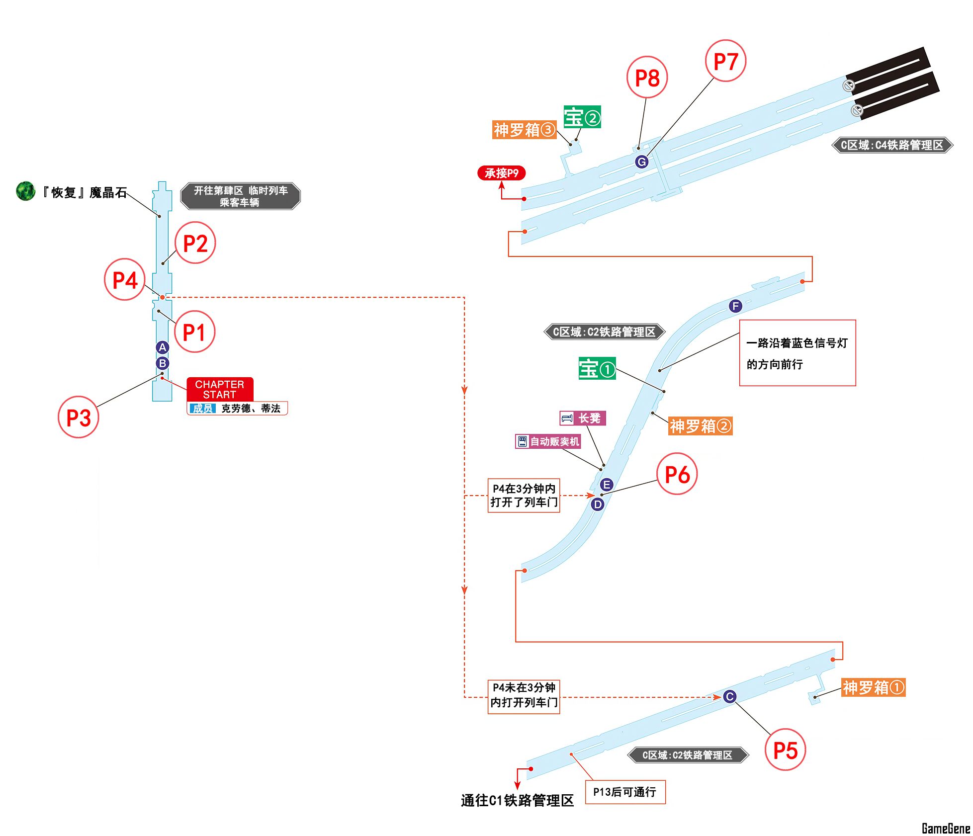 | P4 | 打开前往隔壁列车的门 | 3分钟内打开车门,克劳德与蒂法一同跳下列车进入P6流程 3分钟内没有打开车门,克劳德单独跳下列车进入P5 |