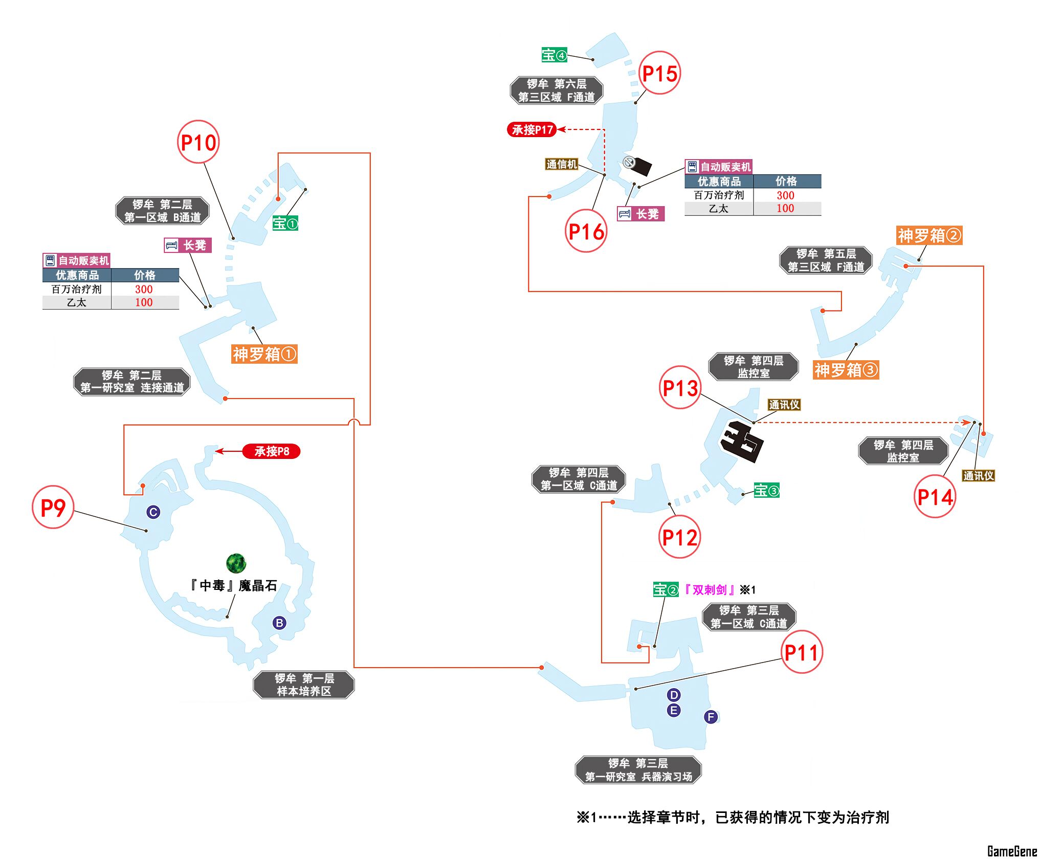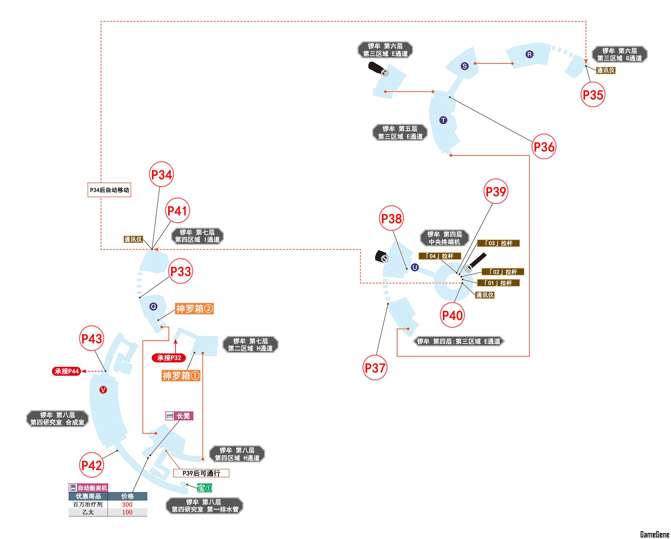 | P38 | 调查拉杆 | 战斗:激光扫射机×2+电击扫射机×2 |