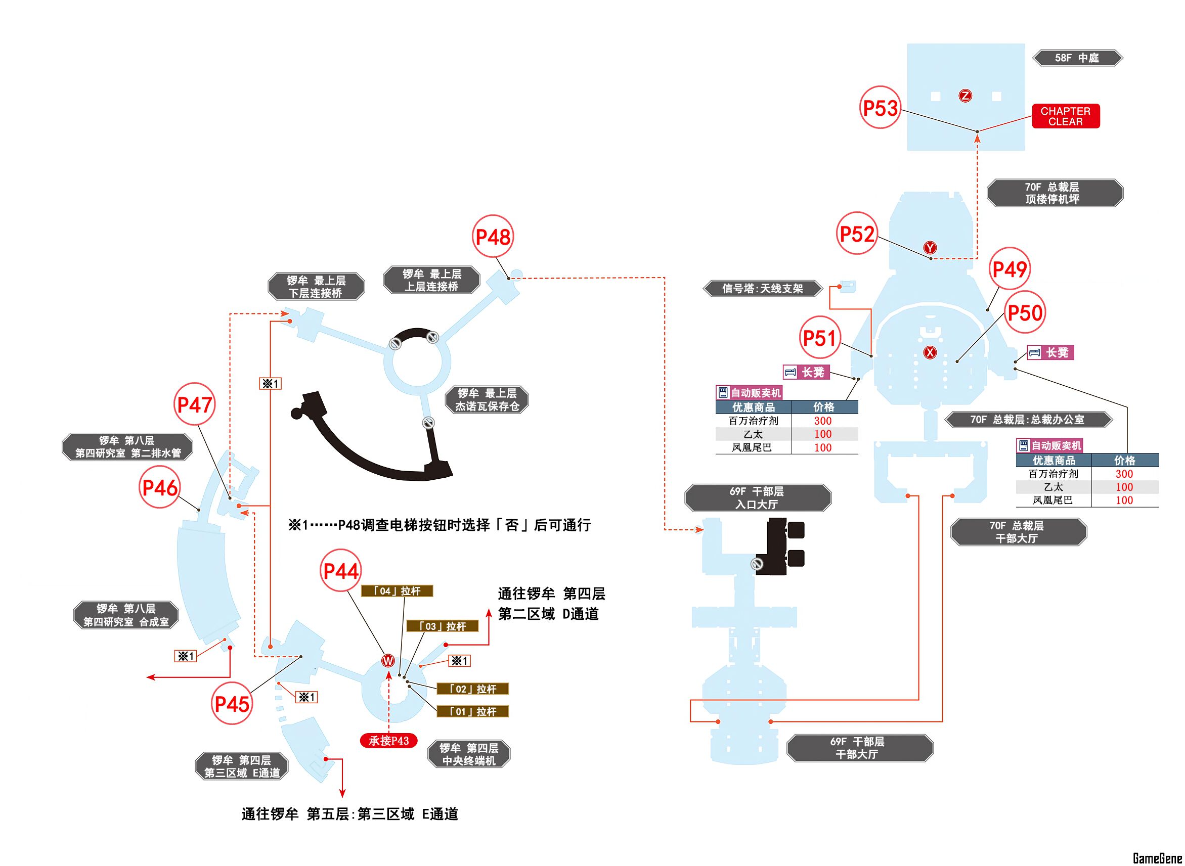 | P48 | 调查电梯按钮前往顶楼 | 此时选择「否」可探索其他区域或返回之前区域 |