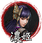 | No.13 |  | 浓姬 Nō CV:藤井雪代 【解锁使用条件】 完成第一章:信长篇【村木砦之战】 | 「美浓的蝮蛇」斋藤道三之女,冰山美人。 受父亲指示嫁给信长,成为信长之妻。 最初对信长完全没兴趣,也不肯敞开心扉,但是随之时间的流逝逐渐开始变化。 |