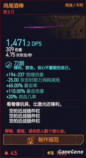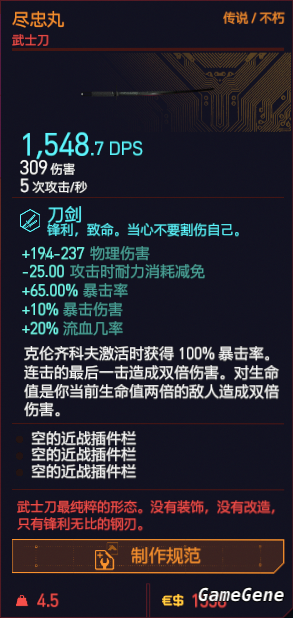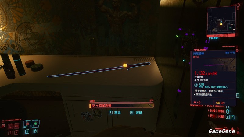 | 觉 | 武士刀 | 主线任务「偷货」进展到V和杰克需要从荒坂塔顶楼逃跑的时候,先别从玻璃门出去,从荒坂三郎下来的室内楼梯一直上到停机坪,解决两个敌人后,可以从荒坂三郎的飞机上拿到。错过也可以通过卡bug的方式回来拿(比较麻烦)! |