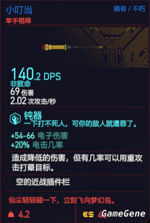 | 小叮当 | 单手棍棒 | 主线做到一定程度之后,市长候选人会给你派一个任务「向法律宣战」,完成任务,选项无影响。完成后跳时间可以接到后续任务「猎杀」,和瑞弗一起去寻找他的侄子。进入农场中间的房子(不是仓库)房子二楼右手第一个房间最里面有一个没有开的门,电源在桌子下面,打开后可以拾取到小叮当。武器只能在任务中获得,任务完成后房屋会无法进入。 |