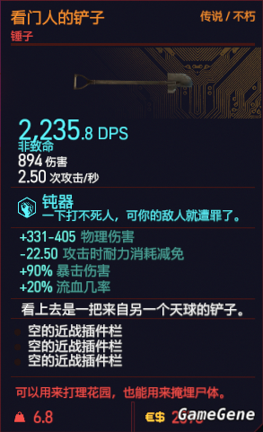 | 看门人的铲子 | 锤子 | 最后选择罗格结局,之后在任务「敲响天堂之门」中,也就是和罗格一起降落到荒坂塔楼顶丛林的时候,可以从罗格身边拿到这个武器。 |