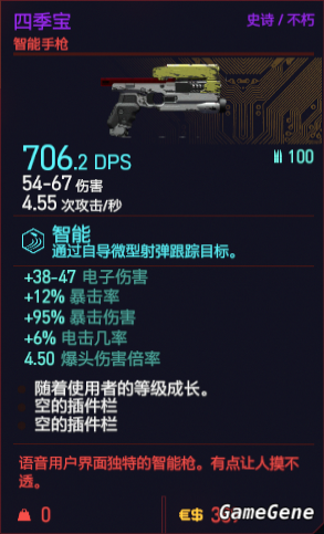 | 四季宝 | 手枪 | 没有前置任务,游戏一开始就可以来拿,在丽景区射击场传送点北边的一处小巷子里。这把枪有个特点,会随着使用者的等级提升而成长。另外,触发手枪的剧情(需要等到主线进展到黑梦)之后选择锁定头部模式或者锁定膝盖模式都行,干掉50个人之后会触发对话切换到另外一个模式,然后再干掉50个敌人,触发任务「随身小宝」,这时候选择不把枪还给主人,就可以放到自己家里的储藏处了,可以在家里的墙上可以看到它。 |