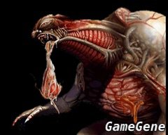 | G成体 G-Type Adult | 初期寄生虫生长,直到一定程度后会破体而出,被寄生者开始会感到胸口郁闷疼痛,到最后胸腔被撕裂,死状相当凄惨,长成后的G幼体已经可以不必重复寄生繁衍后代,从口中不断吐出幼虫攻击,不过幼虫相当软弱,他的速度不快,攻击时只是从远处攻击,要小心不要被幼虫缠上。 |
