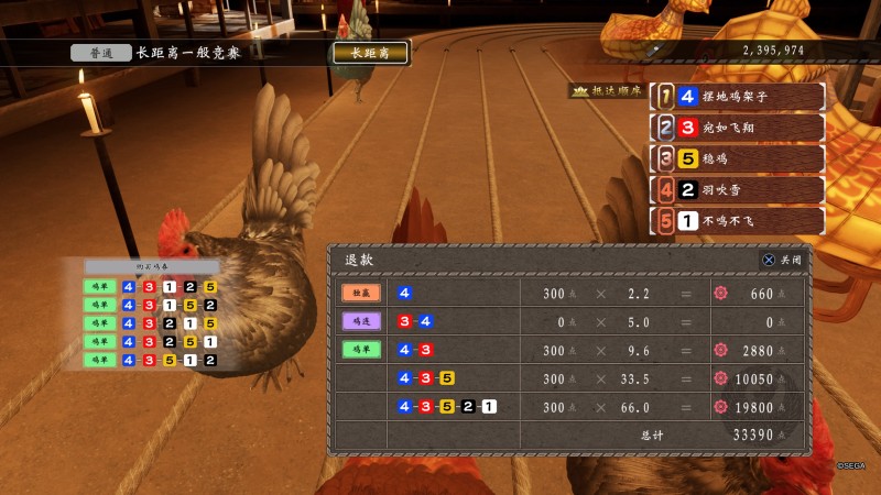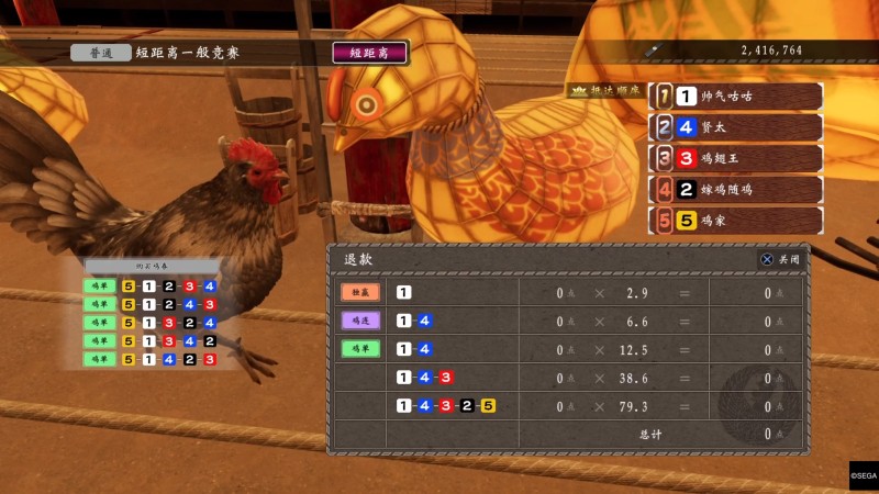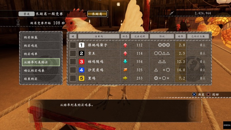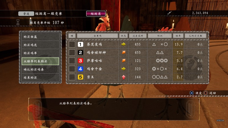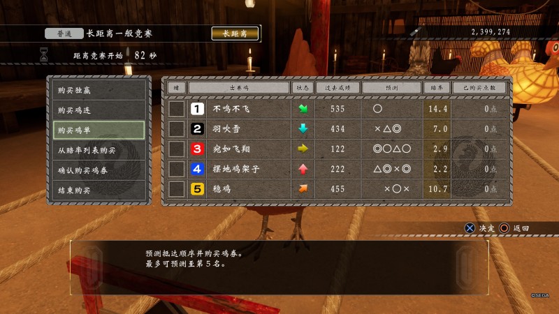 关于赛程,最好只玩长距离,长距离爆种的情况最少,中距离变化太多,遇到直接不买开赛,进赛鸡场之前记得先存档。可以直接看末尾的结论,另外从赔率列表购买的时候,买三连和五连的,用左摇杆能快速下拉,十字键只能一个个按太慢。