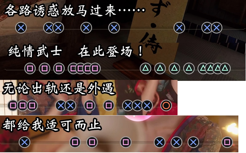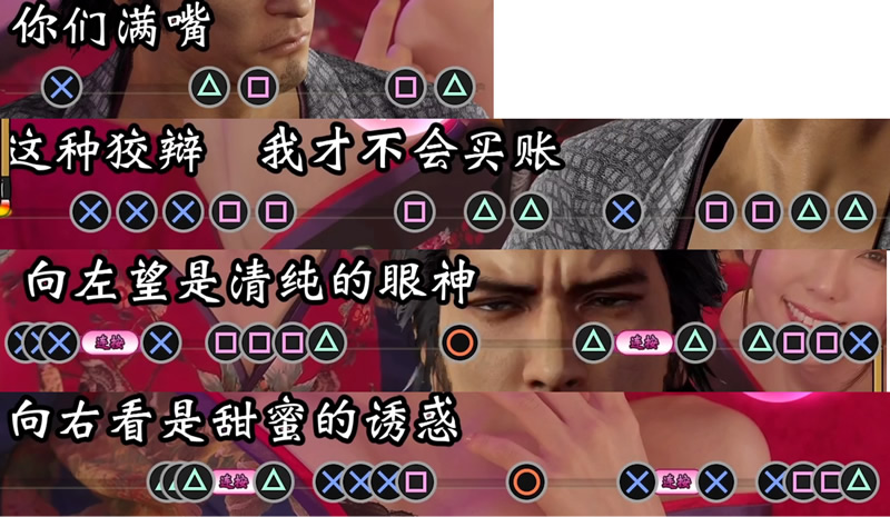 第五段,难点在第二第三句,第二句是逆时针按一圈,第三句又变成顺时针按了,由于速度快可能反应不过来,可以用暂停来慢慢熟悉,一句一句的按,第三句最后的圆圈,叉,方块也是易错点。
