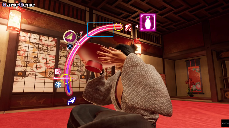 第一部分是喝酒,在保证游标不碰到黄圈区域的同时,目的是把游女灌醉,看似不限时,但是游女会随着时间把醉意解除,拖越久越难赢,因为后面越喝越多。