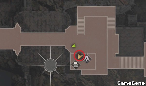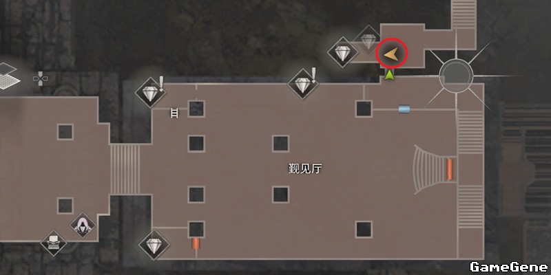 出门后,来到觐见厅2楼,先向右走到尽头,把如图黄圈的梯子放下去,一会拿宝藏后能回来。