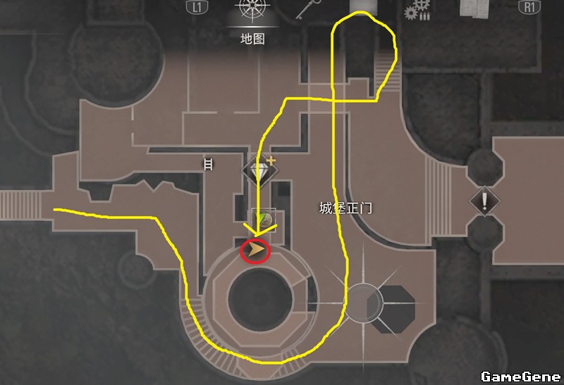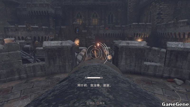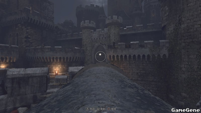 向前走到达城堡正门,此时投石车开始攻击,一边躲开投掷物,一边按照黄线来到炮台处。