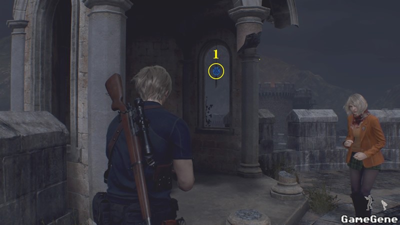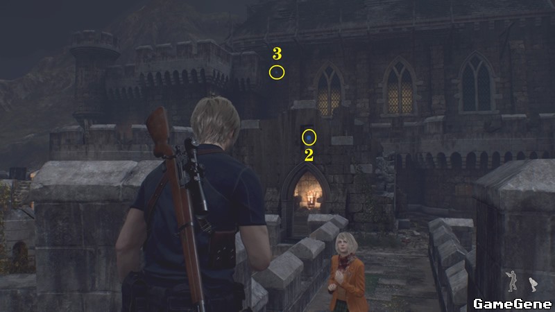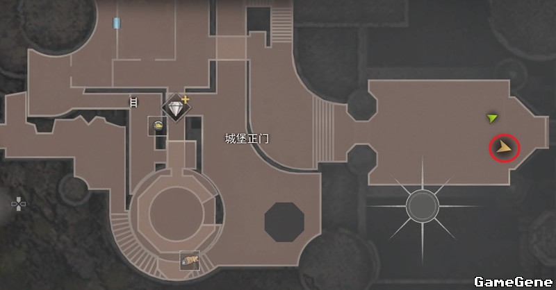 返回城堡正门,大炮所在的平台,先是地图南侧小亭子,换个角度能看到,窗户处有第1个蓝色徽章,用枪打掉。