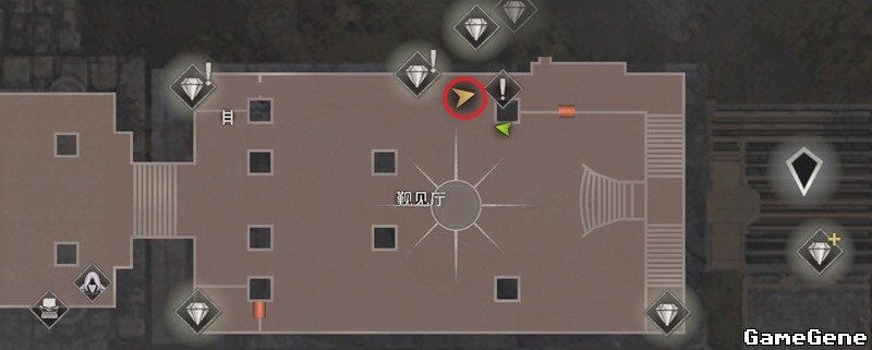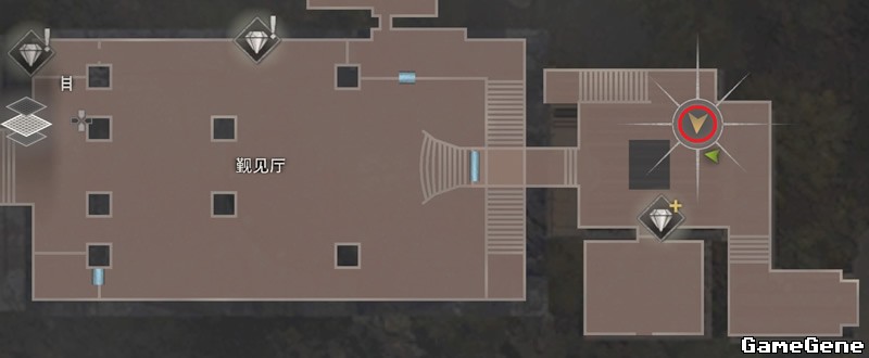 拿到钥匙后,触发铁爪“加拉多”剧情,把铁爪“加拉多”引导如图位置,躲在屏风后面,蹲着走过去暗杀铁爪“加拉多”,暗杀一次后马上换地点,期间可以对角线碰链子引他过去,然后马上蹲着绕开,等铁爪“加拉多”冷静后继续暗杀(小刀不够的四个对角箱子其中一个有一把靴刀),暗杀死后获得成就【无声刀客】。杀死铁爪“加拉多”获得宝藏:红色线柱石。