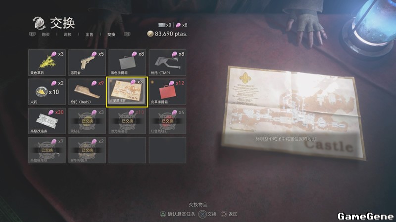 与商人用3个尖晶石兑换城堡藏宝图,地图界面右下角显示41个宝藏。商人处还可以购买武器及配件:折翼蝴蝶,配方:马格南弹药。