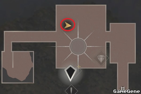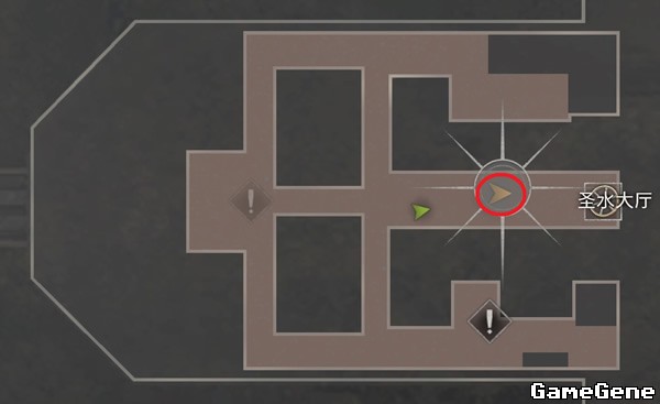 向东走进入圣水大厅,大厅两侧都有一些补给,把教徒引导中间聚集后,可以手雷炸死或者霰弹枪打死。从1楼东侧的平台,向下方-1层跳下去,再解决几个教徒后,爆虫的教徒可以直接霰弹枪打死,另外-1层中间有个油桶。在如图正中间雕像处,拿到关键物品:光晕转轮。