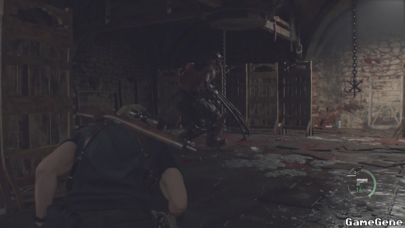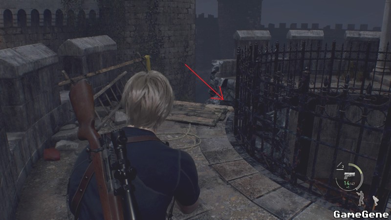 2楼这里,把阿什莉托上去,让她升起平台,期间用狙击枪和手枪掩护她。