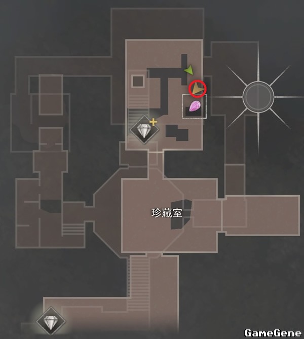爬梯子上来后,在珍藏室北部房间内,如图位置,左侧木柜上,酒瓶旁边有宝藏:尖晶石,右侧货架上有城主人偶:第7个。