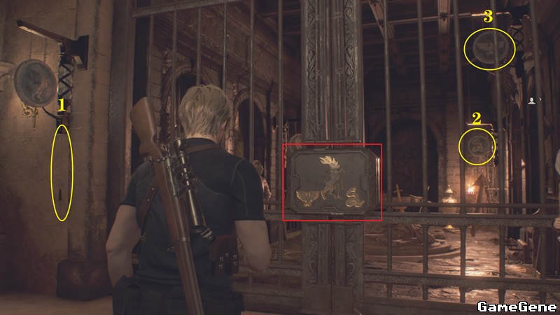 首先来到东侧铁门这,根据铁门上的提示是鹰,马,蛇,但是不需要按顺序,只是限时,因此才需马蛇鹰的方式解密,先拉马的拉绳,然后用手枪射击蛇和鹰,铁门打开,进入内部在地上躺着的浮雕获得血剑。
