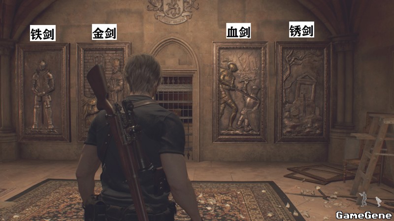 然后去4个画框里,再把金剑,铁剑,锈剑回收,按照如图顺序放上去,从左往右铁剑,金剑,血剑,锈剑。