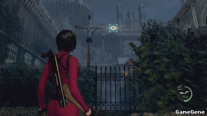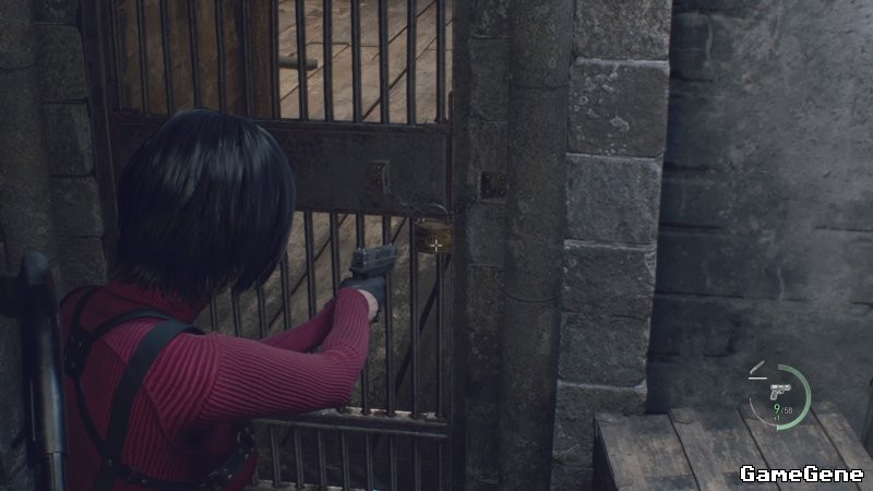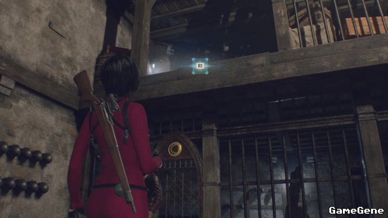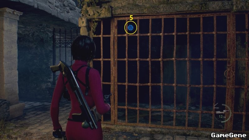 绳枪回去,再向中庭西南方绳枪过去,狗笼子里,看到第5个蓝色徽章,用枪打掉。(ps:这里也是正篇里昂遇到关着3只狗的地方,正篇这里靠近会笼子门爆开,狗跑出来)