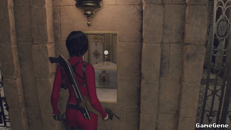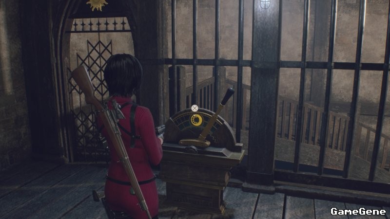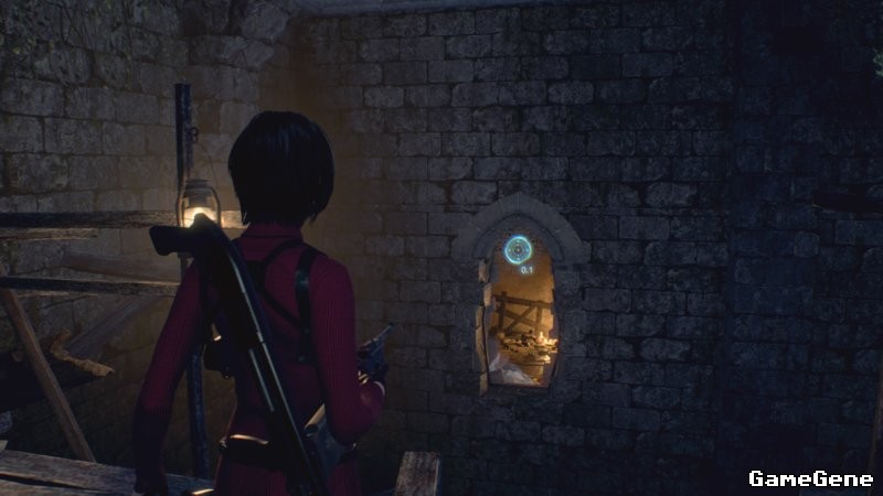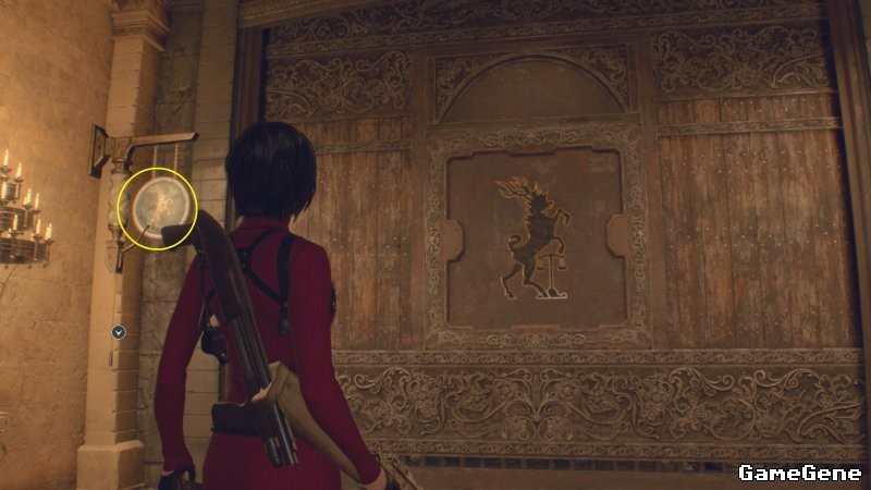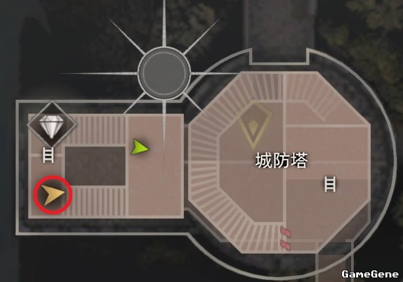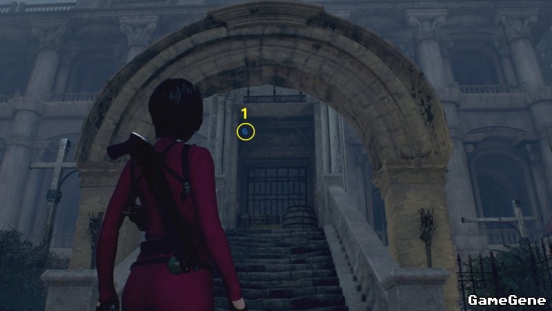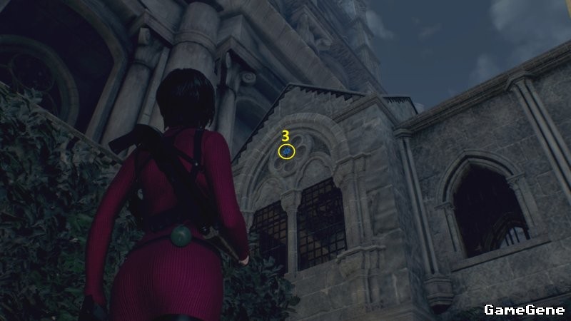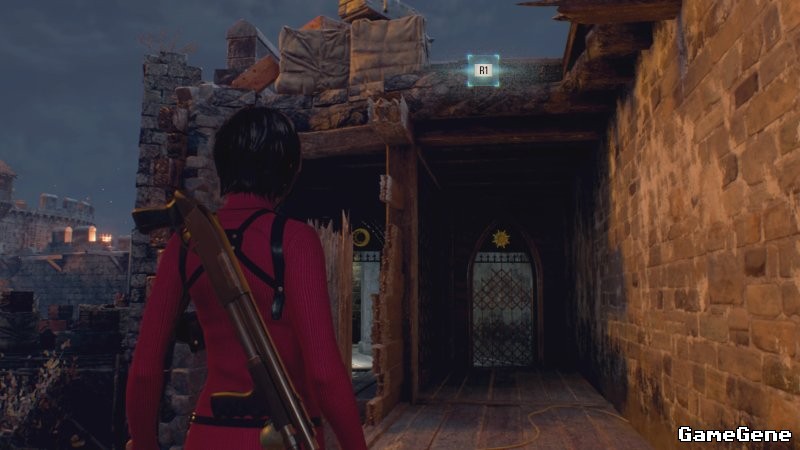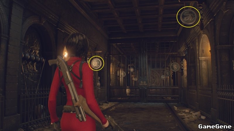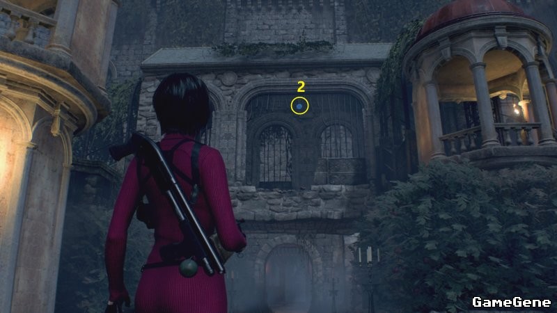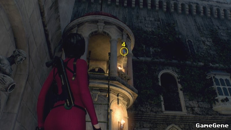中庭东南方的绳枪过去,就在如图塔内石柱背后,看到第4个蓝色徽章,用枪打掉。(ps:这里也是正篇里昂拉下第2个机关闸的地方)