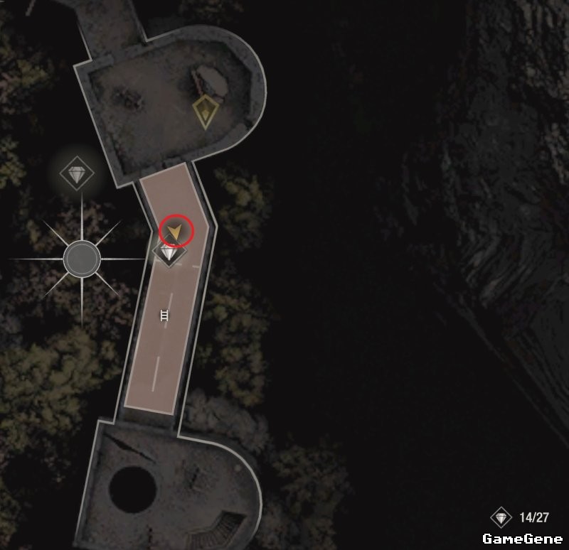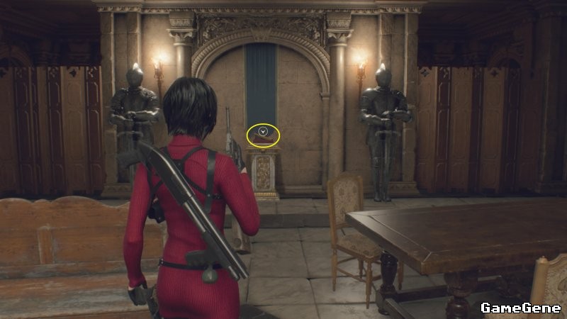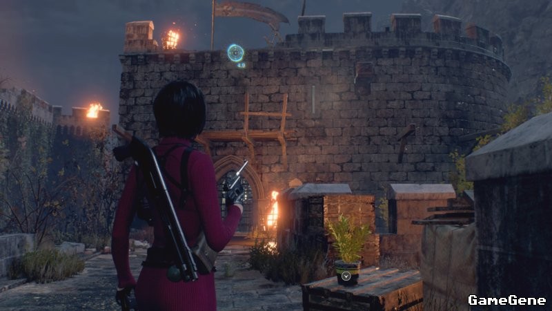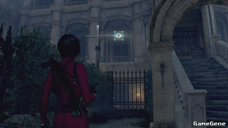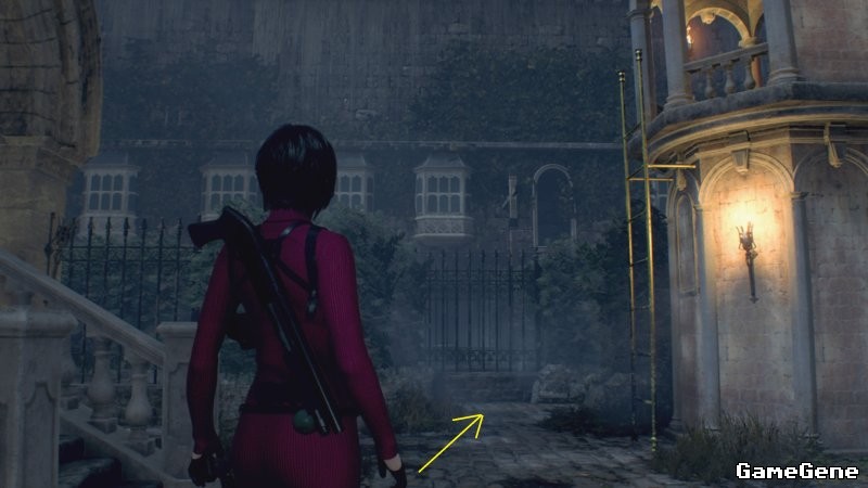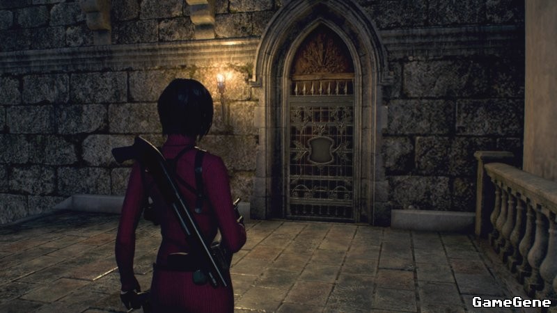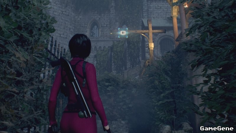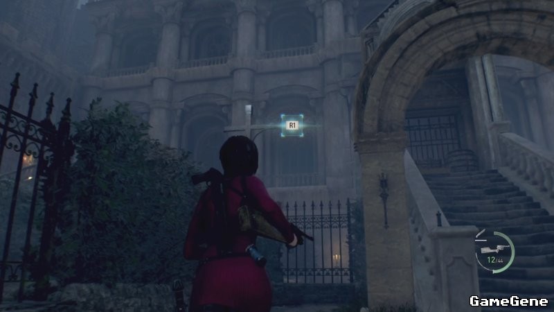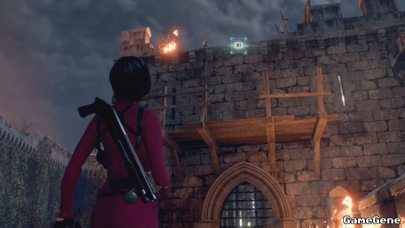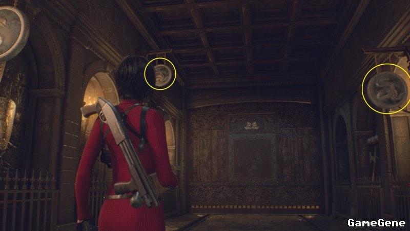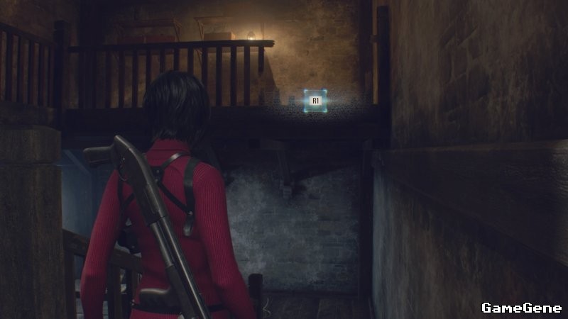 中庭东南方的绳枪过去,就在如图塔内石柱背后,看到第4个蓝色徽章,用枪打掉。(ps:这里也是正篇里昂拉下第2个机关闸的地方)