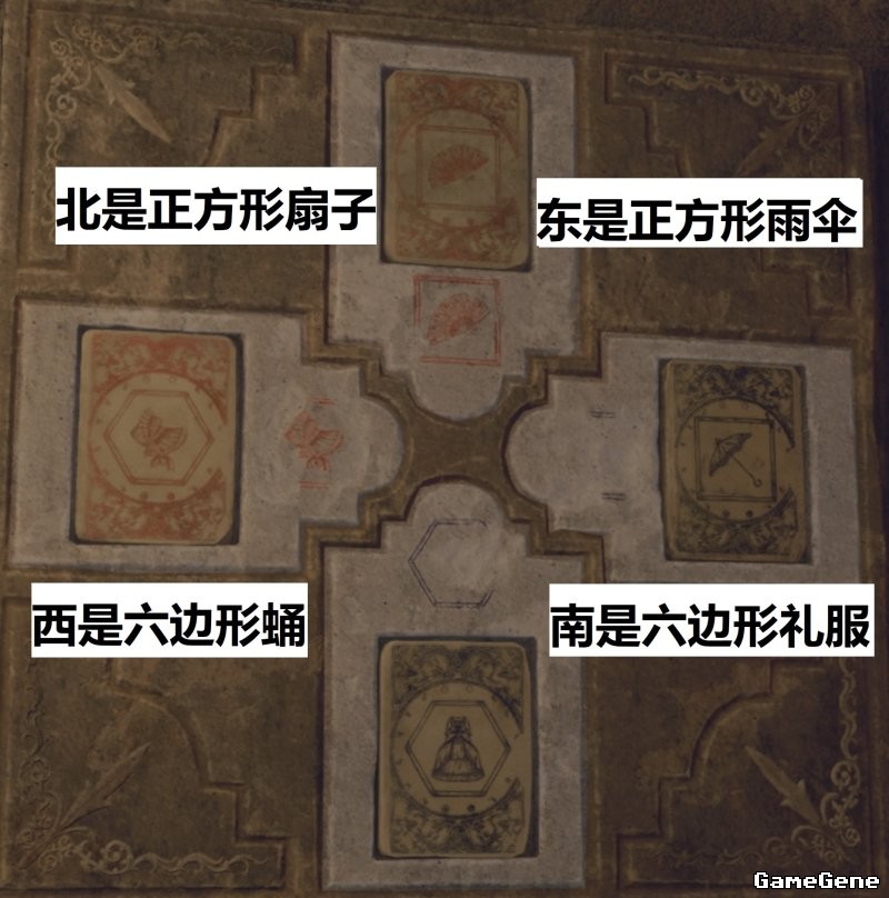 通过调换顺序,东南西北,西是六边形蛹,北是正方形扇子,东是正方形雨伞,南是六边形礼服。