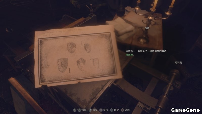 根据版画的提示,在壁炉左上角的5个盾牌,按照如图所示顺序射击,背后抽屉打开,获得关键物品:红色油墨。