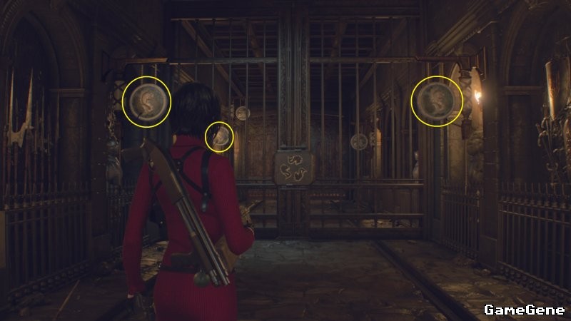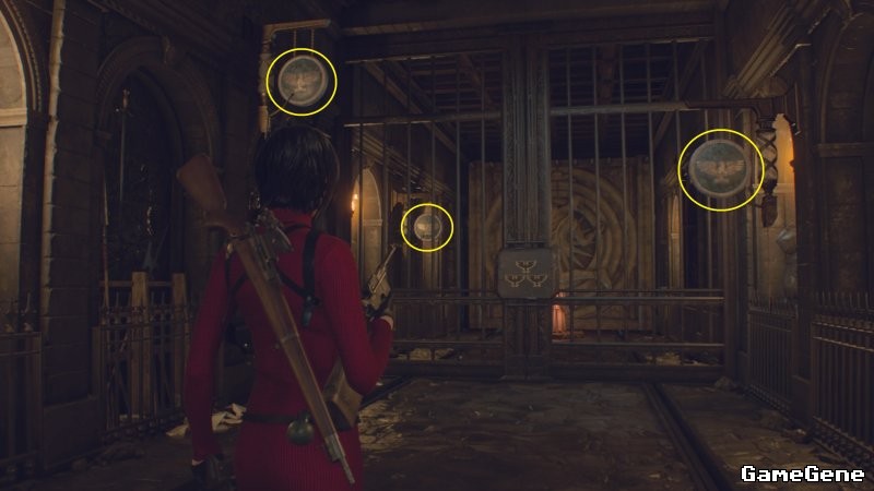 站在中庭正中心处,向前看铁门上,看到第1个蓝色徽章,用枪打掉。