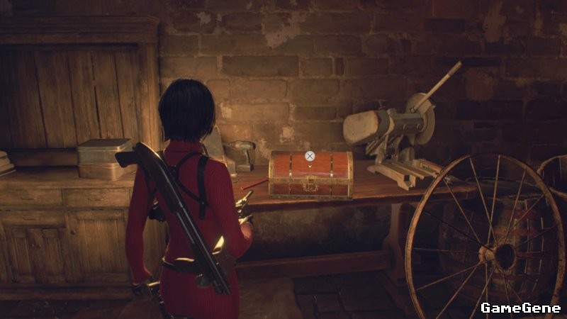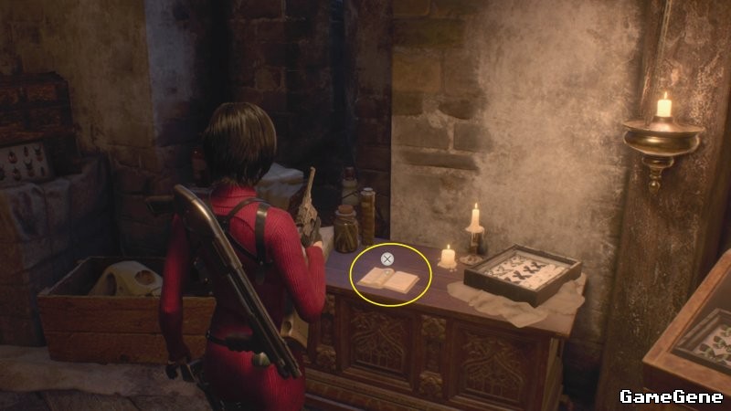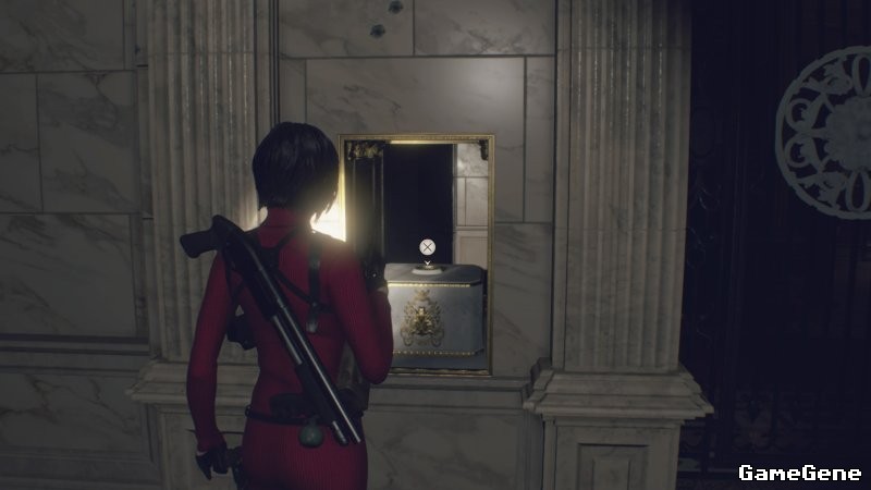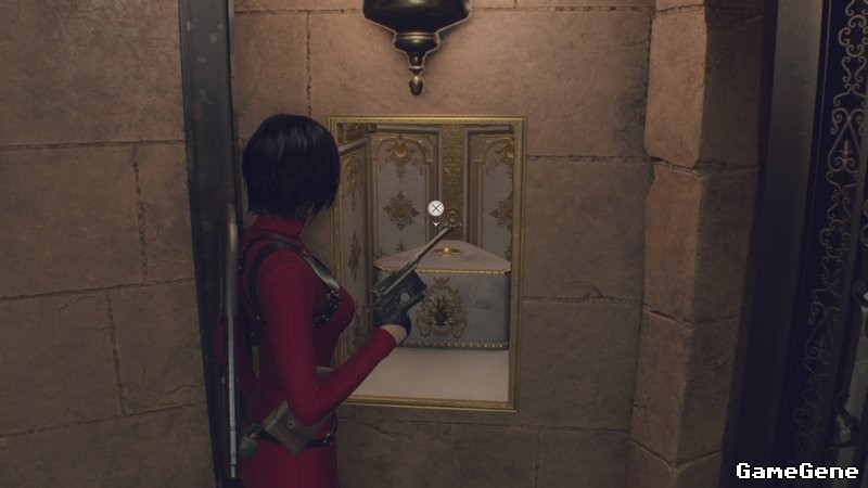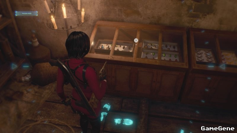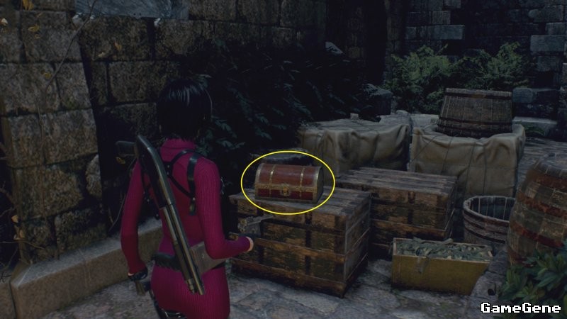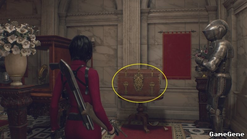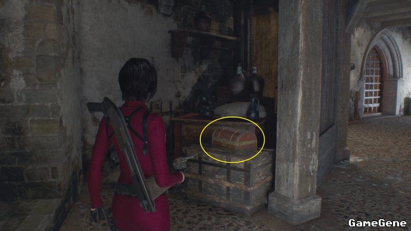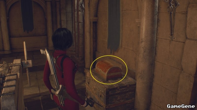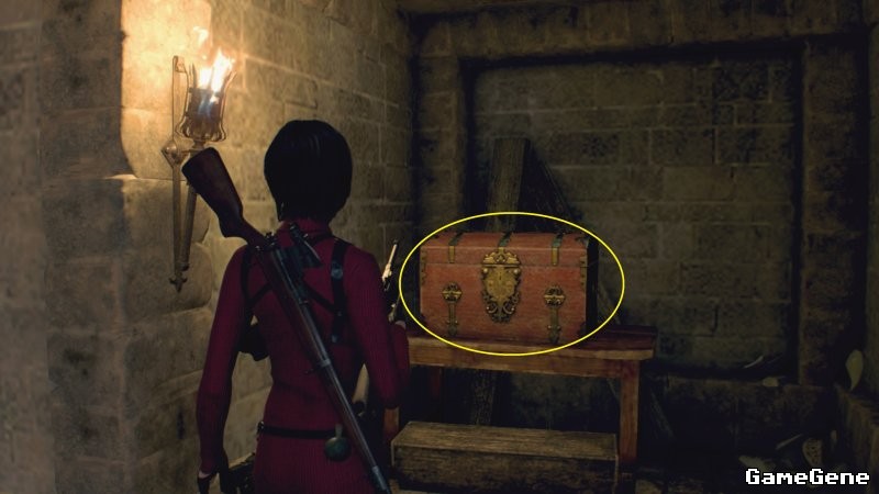 中庭正东方,深处房间内,有一个宝箱,里面有宝藏:妖光蝶提灯。(ps:正篇这里是里昂拿宝藏,华美的棋盘的地方)