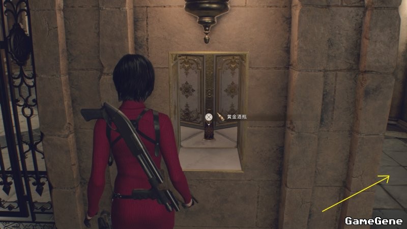 珍宝库插槽的东北面,插槽放入黄金酒瓶,开启闸门锁住的门。
