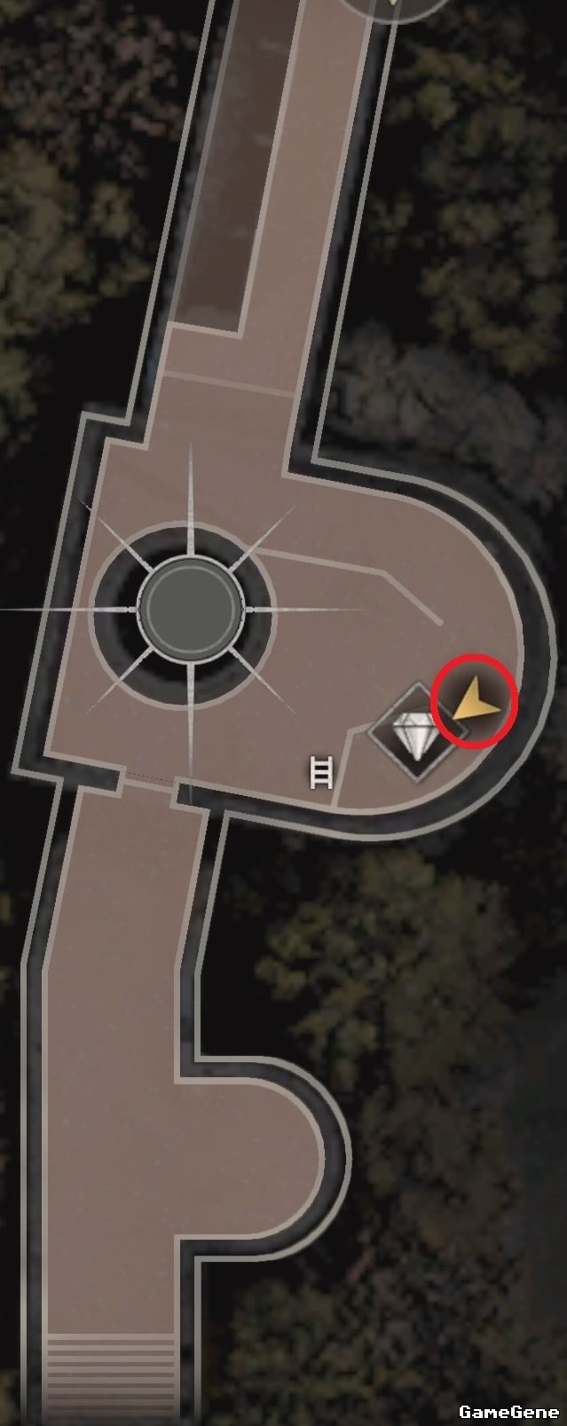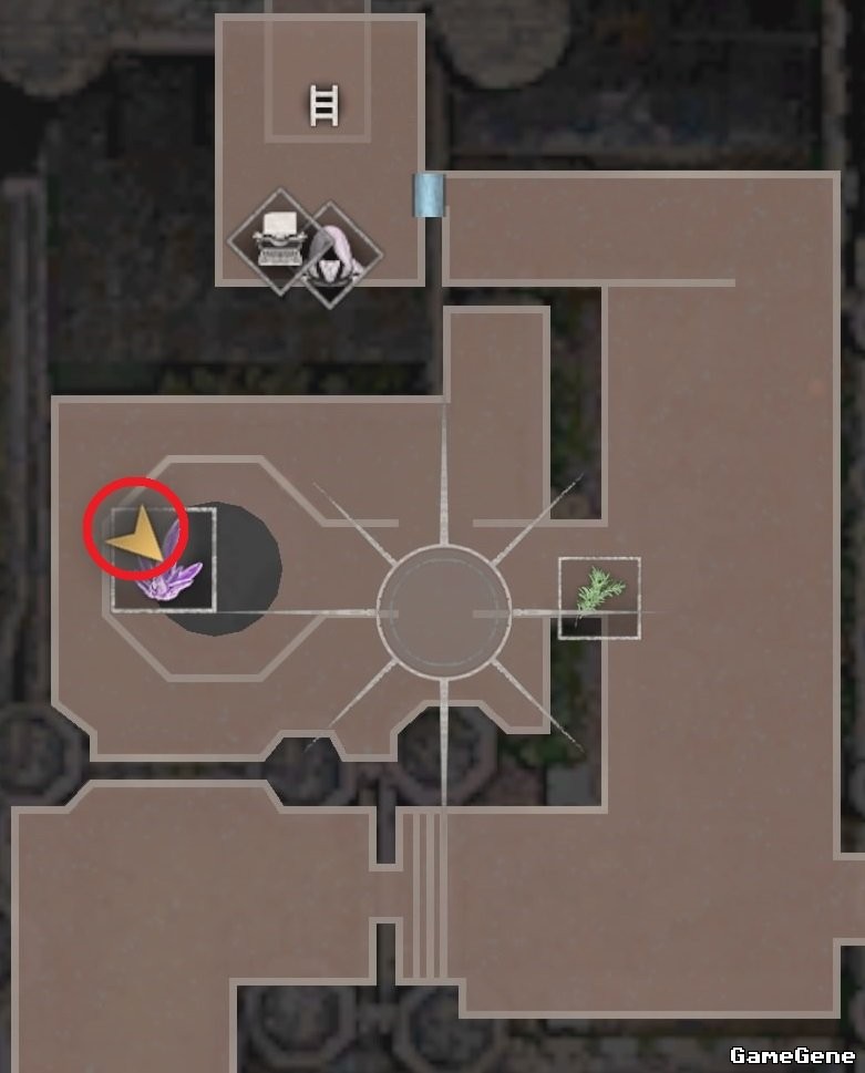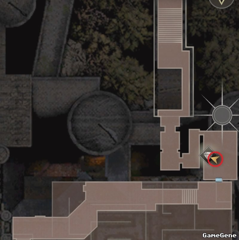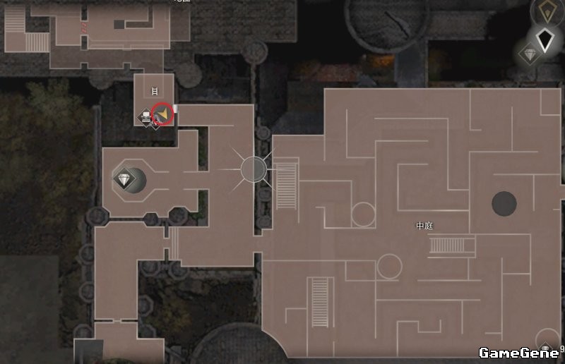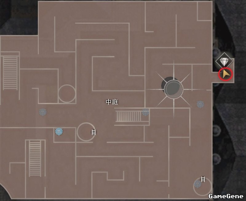 绳枪回到中庭中心处,向如图位置走,进入中庭南部。