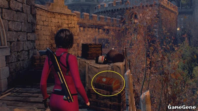 城防塔上层梯子处,如图位置,看到绳枪提示,上去后右侧深处,有一个宝箱,里面有宝藏:金条(大)。(ps:因为第一章就是城堡的宝物,所以从第4个宝物开始计数,地图右下角也能看到)