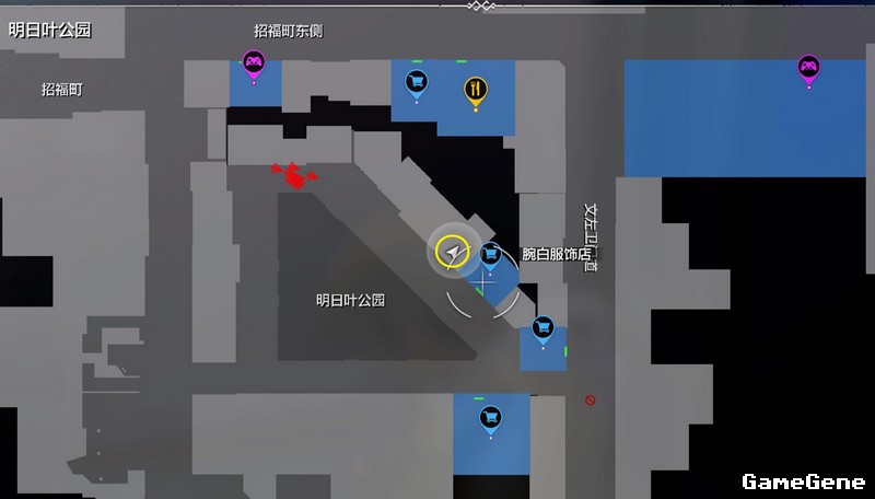 位置:明日叶公园西南方,“Four Shine”店门口女子。