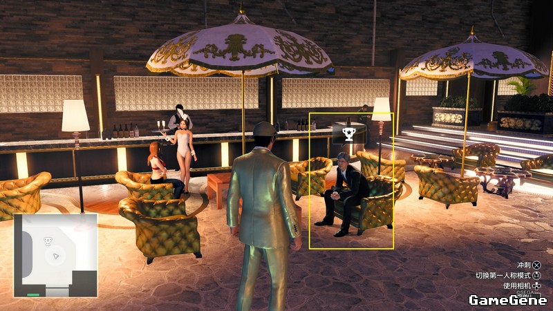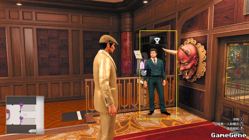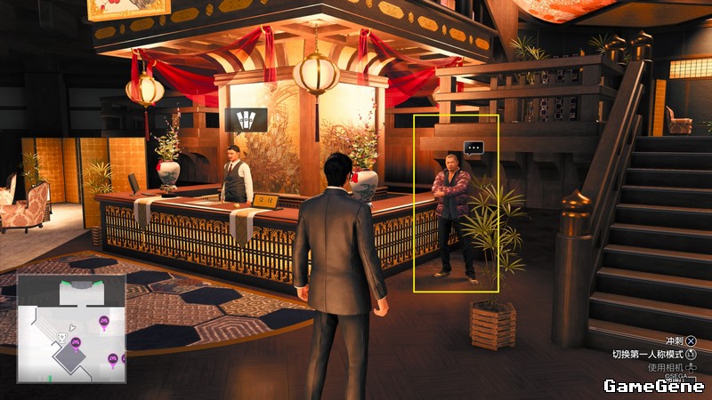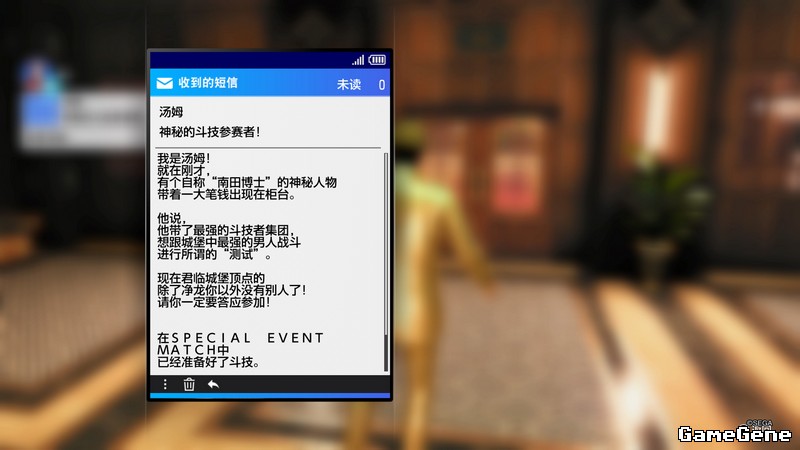 第二章收到短信后,日式赌场内,如图位置,与打中有赏老板对话解锁项目。打法使用闪避攻击,X+方块,或者八方击先向前打后突然打后面,打中一次完成。过段时间出城堡会再次收到短信,打不打都行。