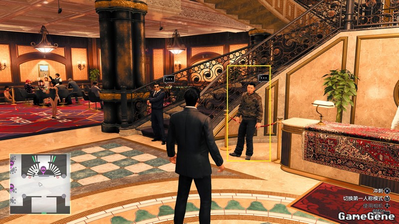 第二章收到短信后,西式赌场内,如图位置,与真·打中有赏老板对话解锁项目。打法使用闪避攻击,X+方块,或者八方击先向前打后突然打后面,打中一次完成。过段时间出城堡会再次收到短信,打不打都行。