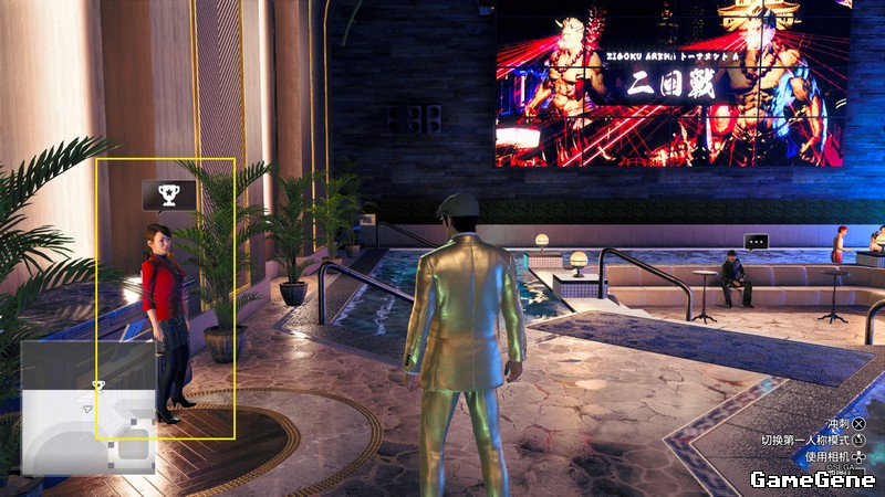 第四章,VIP休息区,老先生在吧台附近沙发上,女子在休息区东侧泳池边。老先生推销带电旋棍,女子推销光剑。斗技场白银赛事全部打完后,再与女子对话,解锁斗技场黄金赞助赛。斗技场黄金赛事全部打完后,再与老先生对话,解锁斗技场白金赞助赛。黄金赞助赛赢一次后收到短信,与VIP休息区女子对话解锁究极赌博斗技。