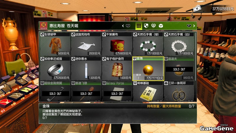 第7个金珠,接支援MAP【62.解开便条上的谜语】(第四章才会出现),也就是苍天堀大街,大阪王将背后,坐在椅子上的男子对话,接了任务后再去招福町,4个金色乌龟的柱子,对面的商店“大气轩”屋檐上金珠,使用蛛丝获得。