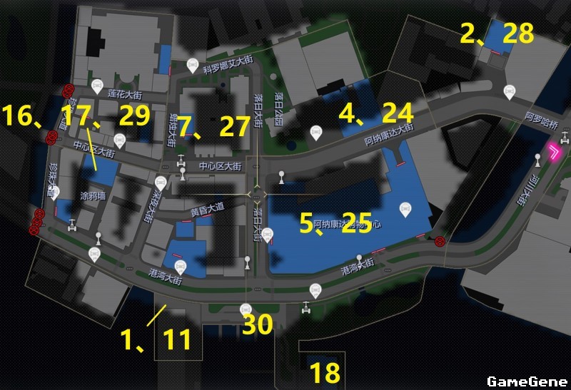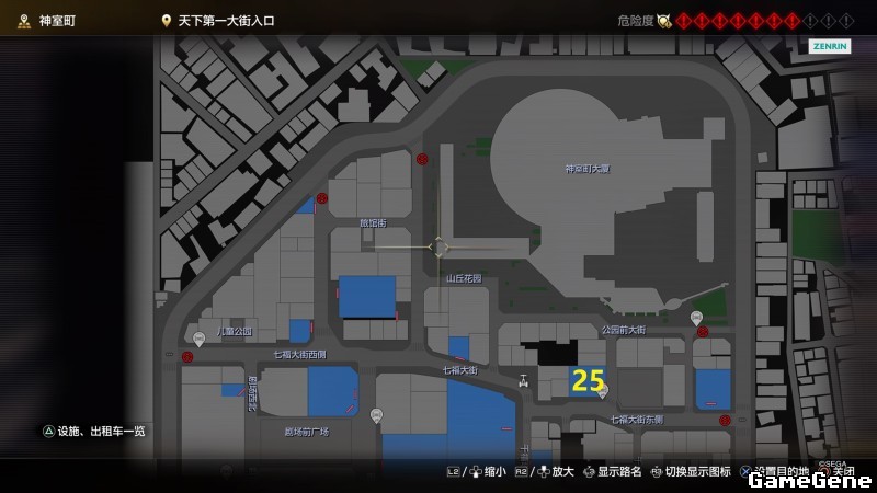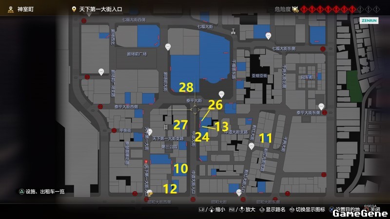 举例子,比如LOVE MAGIC 成人用品店。位置:横滨10,浪漫路东南方。那就在上图10标注位置,此位置再找到街道浪漫路,然后就能找到商店。