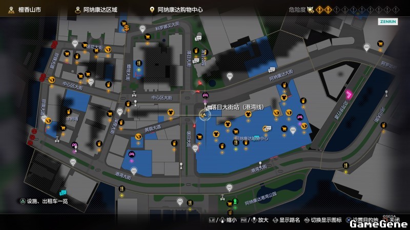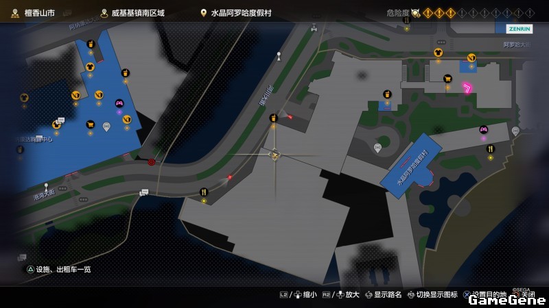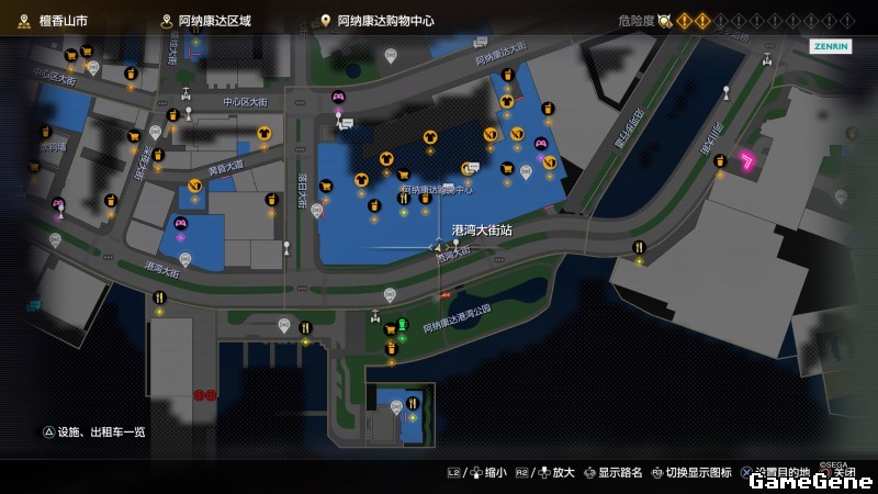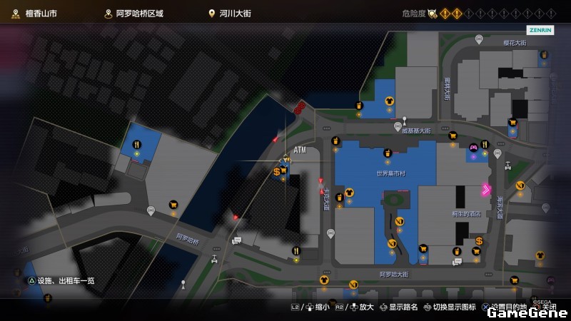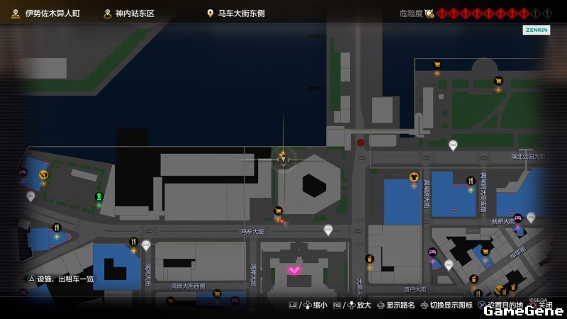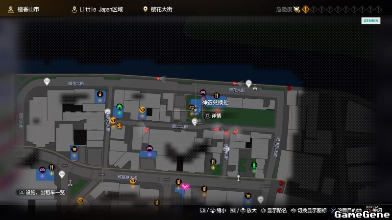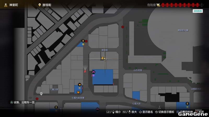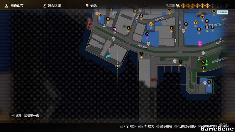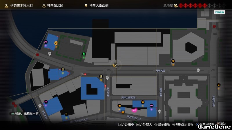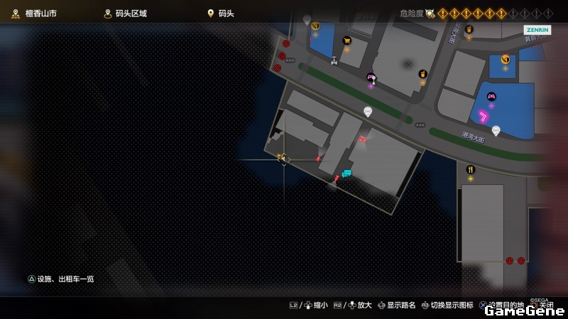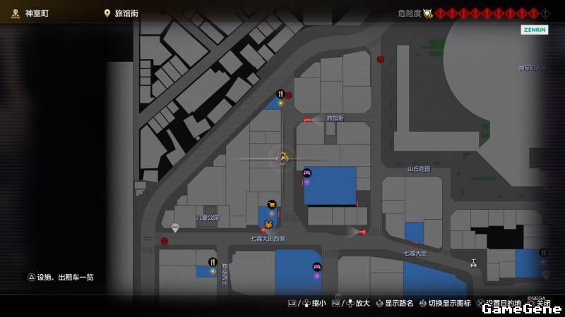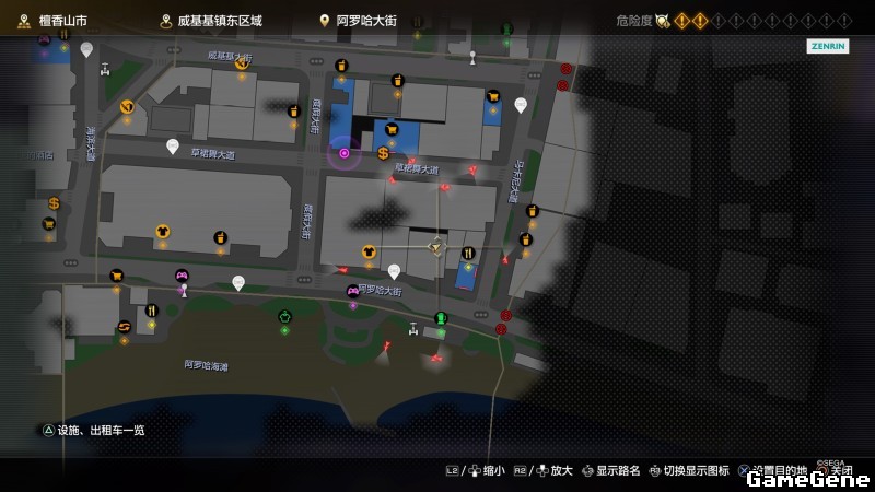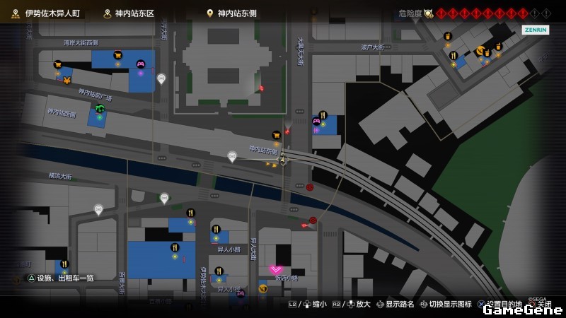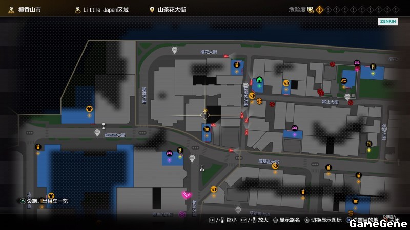 举例子,比如LOVE MAGIC 成人用品店。位置:横滨10,浪漫路东南方。那就在上图10标注位置,此位置再找到街道浪漫路,然后就能找到商店。