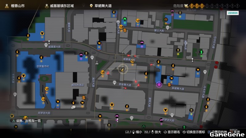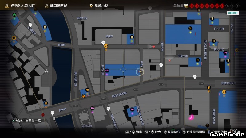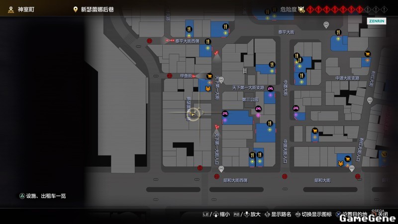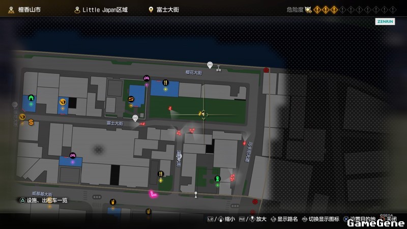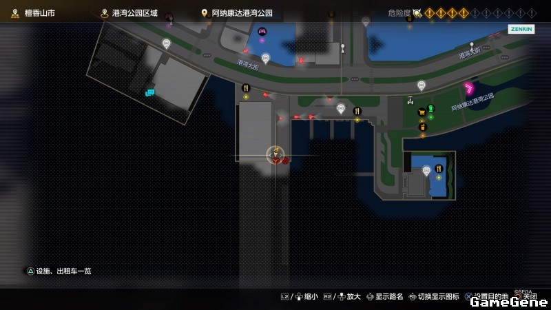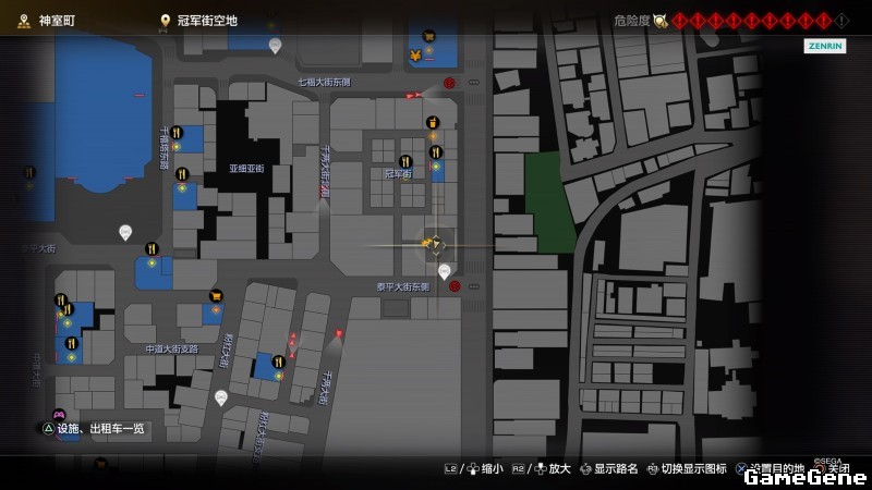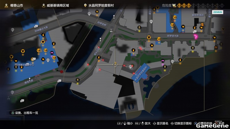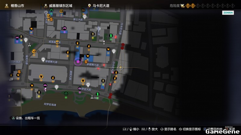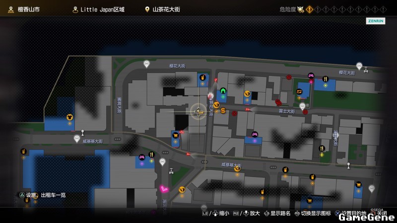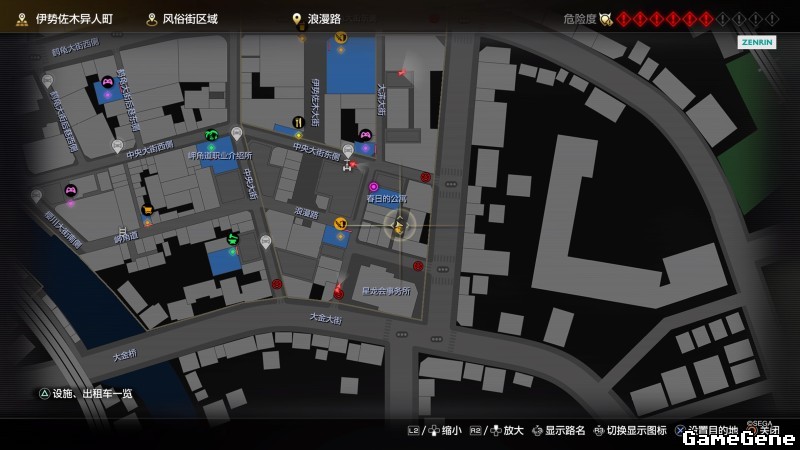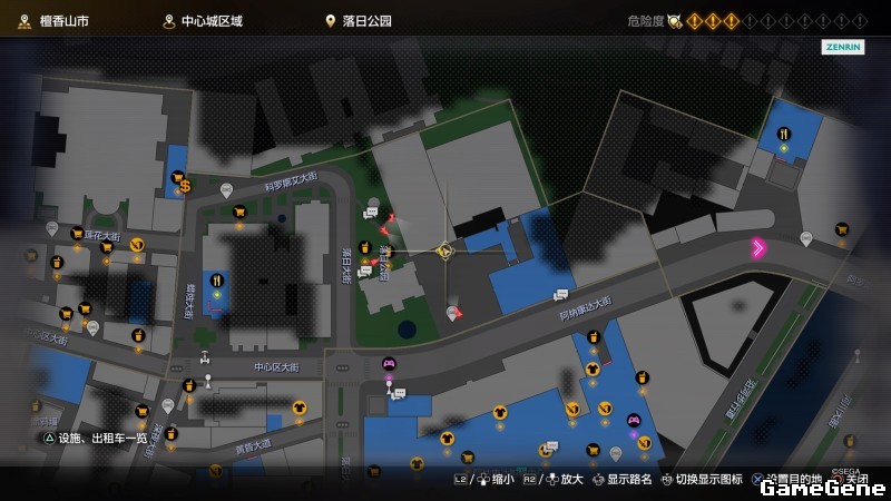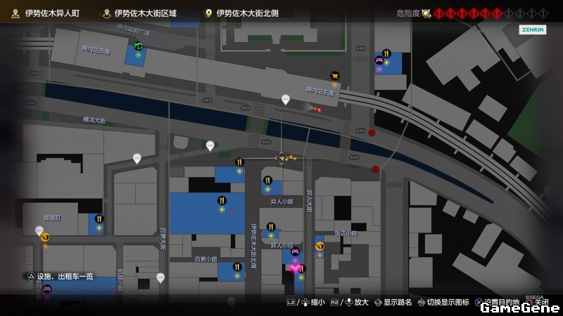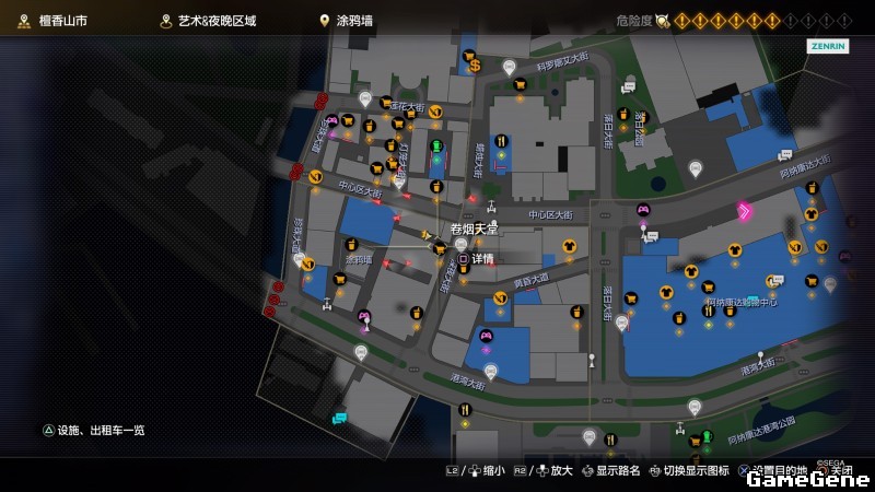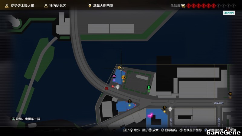 举例子,比如LOVE MAGIC 成人用品店。位置:横滨10,浪漫路东南方。那就在上图10标注位置,此位置再找到街道浪漫路,然后就能找到商店。