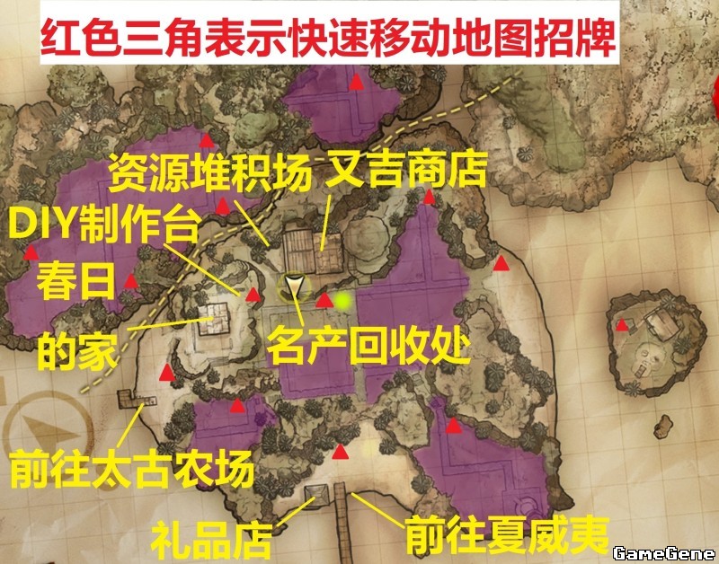 游戏初期,赚取泽尼的方法就是抓虫,如果有金色或者银色就能大量赚钱,普通也值钱,因此前期每日真正任务就是6个地点的虫全抓一遍,然后卖给又吉商店。等到意见箱给足够泽尼后,这些虫开始攒着,用来满足游客。总体位置如图: