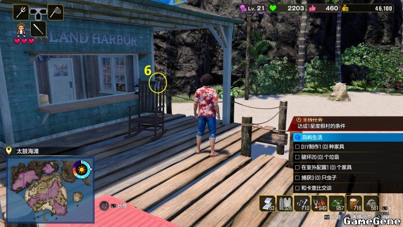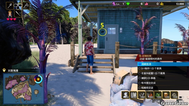 同第3天内容,采集项目还是贝壳,蘑菇等等。破坏还是树木,石头,垃圾等。现在白天先回一次家,再出来触发扩建剧情,然后又吉商店每日贩卖的家具也要开始看看了,如果有好的就买。如果泽尼足够,把球棒升级到LV3,需要15万泽尼,这样状态绝佳时获得的材料从1变成2。大树区域平整土地后,出现卡查比海滩。