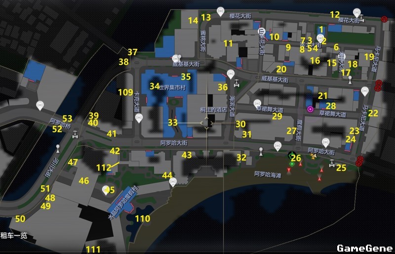 | 44 | 中吉 | 夏威夷4 | 阿罗哈海滩西侧出租车 | 出租车西北方角落 |